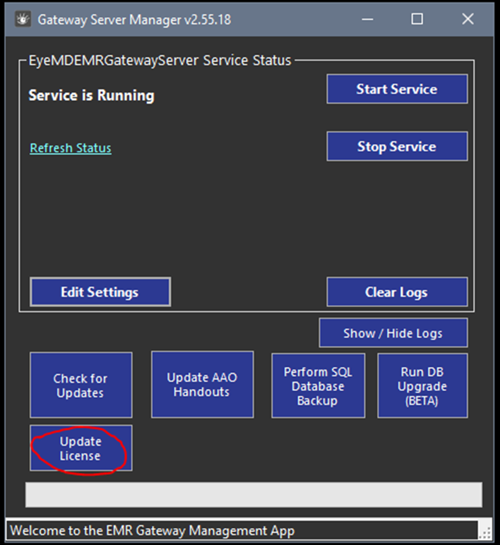 NOTE: If the license is refreshed from the Gateway Manager you will need to restart the gateway for it to take affect.  This is not needed if refreshing from within EyeMD EMR