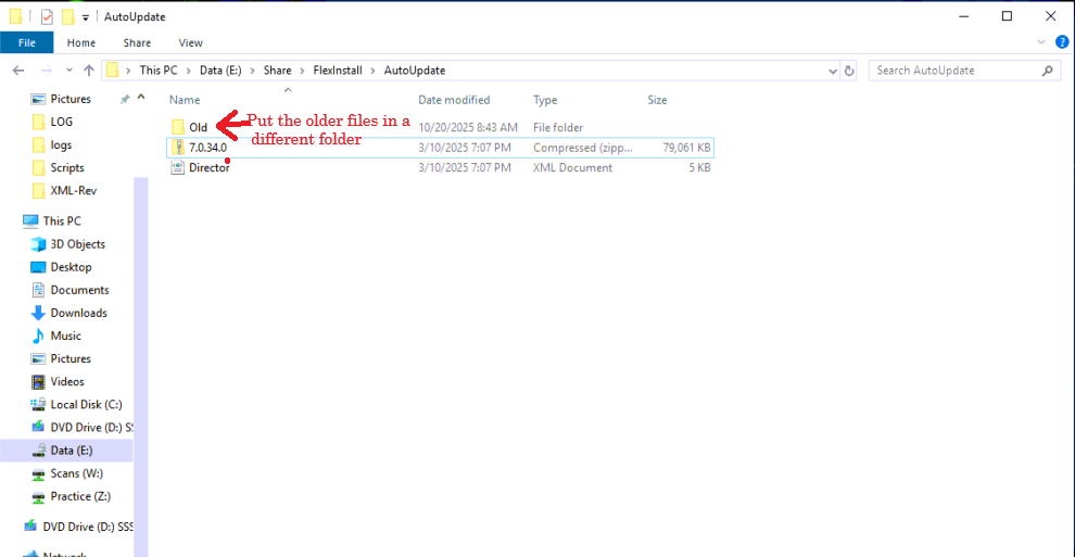 2. On the client server, locate the “AutoUpdate” folder. Typically it’s \\EyeMD_data\FlexInstall\AutoUpdate, but it could be different. Once the folder is located, move any old files into a different folder. Drop the new files directly into the AutoUpdate folder. Do not unzip the .zip file